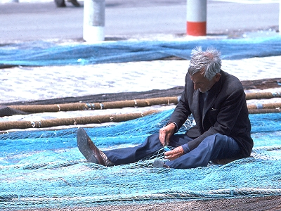 Unbeeindruckt von der Hektik rundum repariert ein Fischer im Hafen von