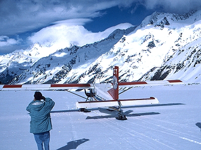 Mit dem Flugzeug landet man hoch oben auf dem Mt.Cook-Gletscher