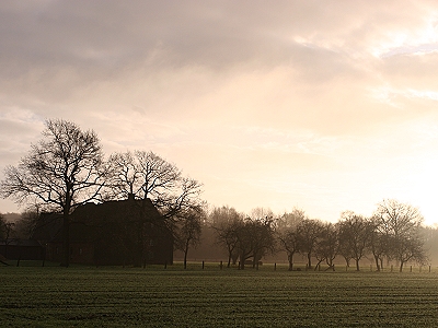 Typisch für das Münsterland sind die hinter hohen Bäumen liegenden
