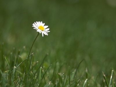 Ein einsames Gänseblümchen inmitten eines kurzgeschorenen Rasens.