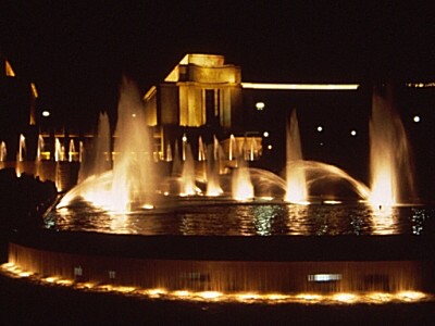 Die Wasserfontänen vor Trocadero in Paris im Licht der Nacht.