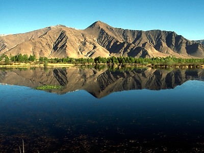 Vor den Toren der tibetischen Hauptstadt Lhasa spiegeln sich die Berge im Kyichu-Fluß.