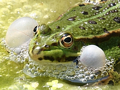 Im heimischen Gartenteich bläst ein Frosch seine Schallblasen auf,