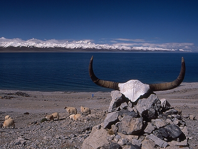 Auf einem Yakschädel am Nam-Tso-See in Tibet haben Pilger