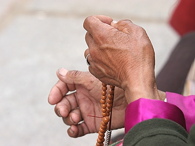 enthält die Gebetskette, die diese Pilgerin vor dem Joghang in Tibets Hauptstadt Lhasa