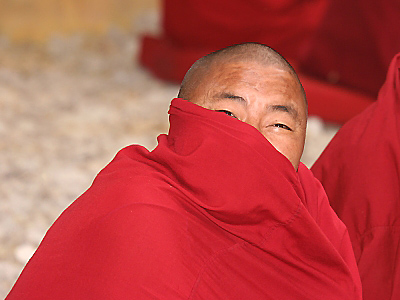 Die vor das Gesicht gezogene Kutte bietet diesem tibetischen Mönch bei