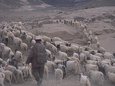Ein Schäfer in Tibet treibt seine Tiere durch die trockende