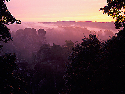 Morgendämmerung in der Sächsischen Schweiz in der Nähe der Bastei.