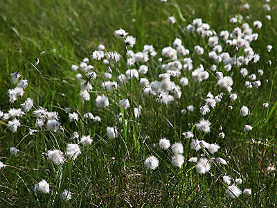 Vom Wind zerzaustes Wollgras in einem Hochmoor bei Marienberg.