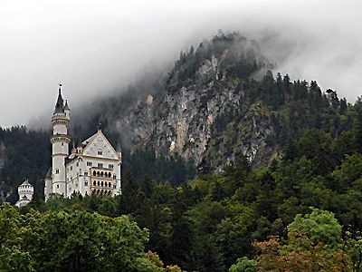 Unter wolkenverhangenen Bergen zeigte sich König Ludwigs Märchenschloss an diesem regnerischen Tag.