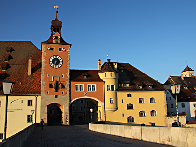 Frühmorgens auf der Steinernen Brücke in Regensburg.