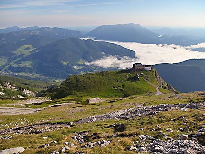 Hoch auf 1.928m thront das Watzmannhaus über dem Tal von Berchtesgaden. Die Stadt selbst ist noch unter einer Wolkendecke verborgen.
