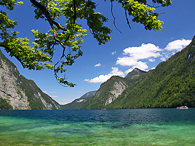 Blick von St. Bartholomä auf den Königssee bei Berchtesgaden.