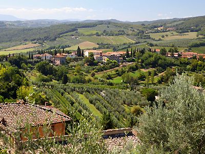 Blick von San Gimiagno über die sanften Hügel der Toskana.