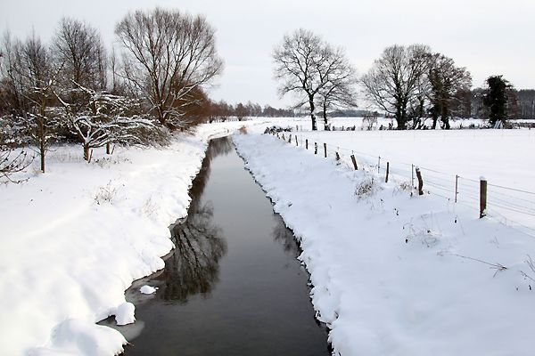 Der Emmerbach am Ortsrand von Davensberg inmitten tief verschneiter Wiesen.