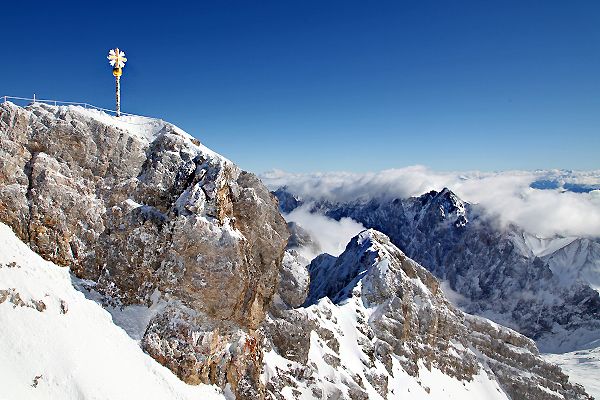 Blick auf das Gipfelkreuz auf der Zugspitze, mit 2.962m der höchste Berg Deutschlands.