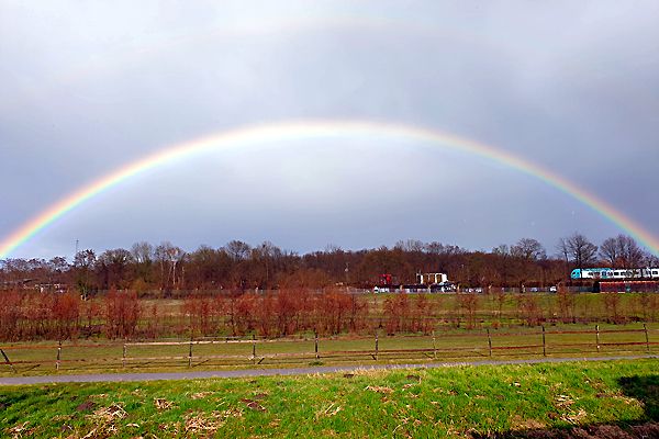 Nach einem kräftigen Frühlingsgewitter zeigt sich ein imposanter Regenbogen über dem Davensberger Bahnhof.